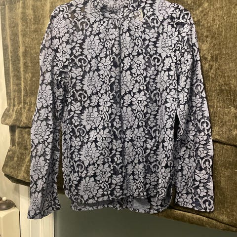 Jerseygenser i størrelse L. Genseren er laget av bomull og har et flerfarget blomstermønster på lys bunn. Den har lange ermer og rund hals med knappelukking bak. Passer til hverdagsbruk eller som et lett lag over annet tøy. Materialet er velegnet for bruk gjennom store deler av året. NB den har en flekk på det ene ermet - se bilder.