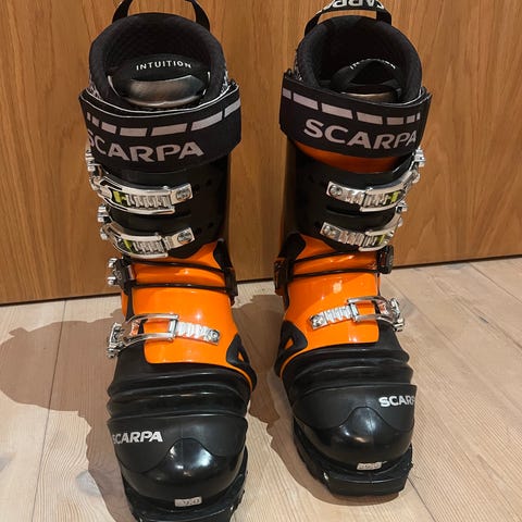 Selger ett par brukte Scarpa TX Pro i mondo 28,5. Vært brukt i en del sesonger og bærer av den grunn naturlig slitasje. Ingen problemer med spenner eller borrelåser. Innerstøvelen er rimelig slitt i helen så denne bør byttes ut.