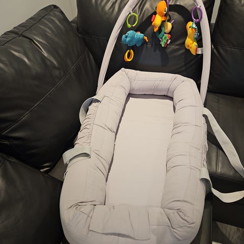 Babynest fra Alice & Fox med en avtagbar aktivitetsbue til å henge leker i. Det har et mykt fyll og en høy kant som holder babyen på plass. Babynestet har håndtak i sidene som gjør den enkel å bære. Dette babynestet kan brukes i barnesengen, i vognen, på sofaen eller på gulvet- uansett hvor babyen din trenger et trygt og mykt sted.