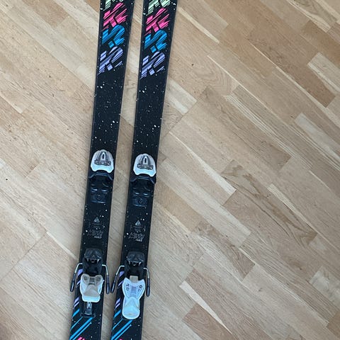 Alpinski med lengde 145 cm og sidecut 113-70-102, radius 10,7 m. Skiene har integrert bindingssystem med justerbare Salomon-bindinger. Design i lilla, rosa, blå og hvit med grafiske motiver.