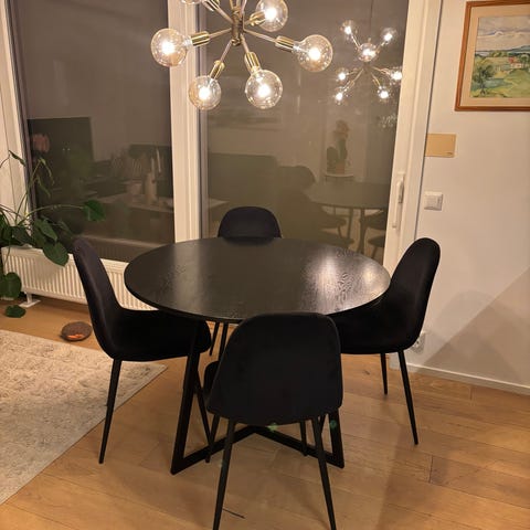 Rundt spisebord med fire matchende stoler i svart. Bordet har rund bordplate og moderne understell i metall. Stolene har polstret sete og rygg med slanke ben i metall. Passer som spisegruppe på kjøkken eller i mindre stue/spisestue, og gir sitteplass til fire personer rundt bordet.