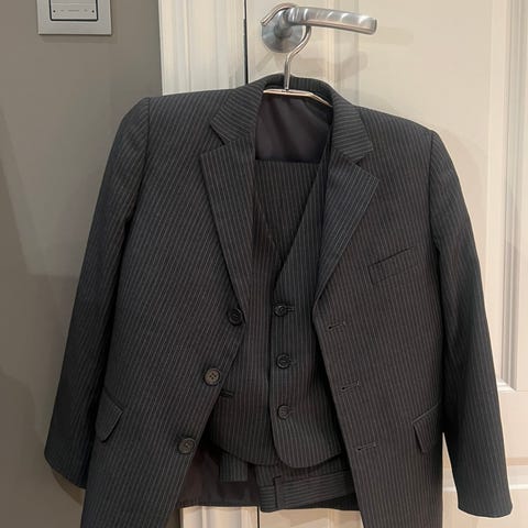 Bukse, vest og jakke. To knapper trengs å festes litt, mens en knapp på en arm er knekt (se bilde).