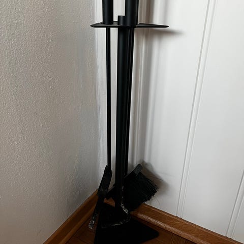 Peissett med stativ i svart metall og håndtak i børstet stål. Settet består av flere redskaper til vedovn eller peis, blant annet kost og ildrake/spade. Stativet har buet design og kompakt fot som gjør det enkelt å plassere ved siden av peis eller ovn. Egnet til daglig vedlikehold og rengjøring rundt ildstedet.