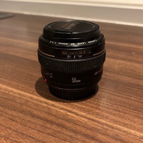 Canon EF 50mm f/1.4 objektiv. Fast normalobjektiv med 50 mm brennvidde og største blenderåpning f/1.4. Objektivet har Canon EF-fatning og passer til Canon speilreflekskameraer med denne bajonetten, både fullformat og APS-C.