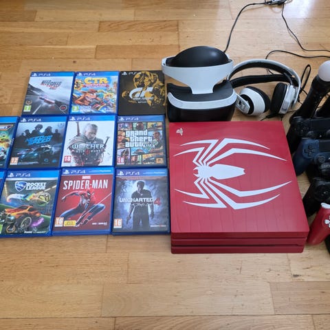 Sony Playstation 4 Pro spillkonsoll hvit med kontroller og PS VR