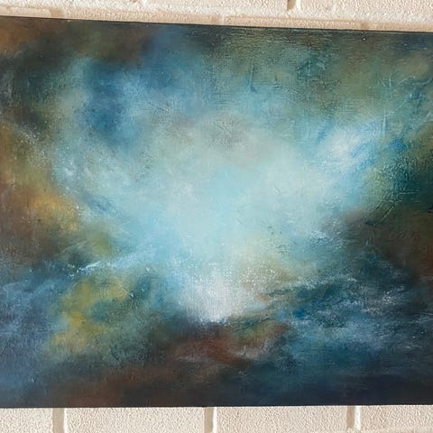 Selger et håndmalt abstrakt maleri laget med akrylmaling. Bildet har rolige, naturlige fargetoner i grønt, beige og hvitt, og gir assosiasjoner til landskap, skog eller kystlinje.