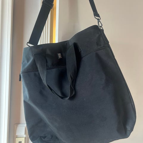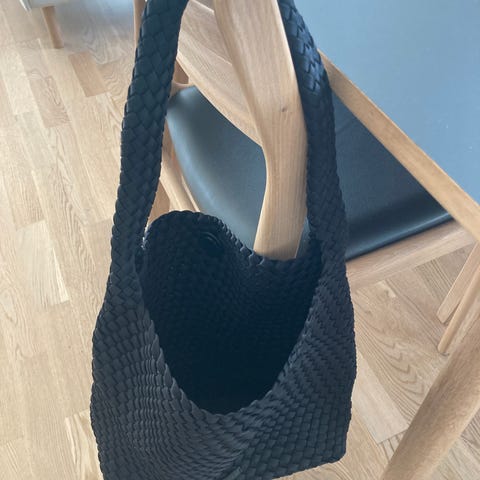 Selger en Abby Black-veske fra Muun. Vesken har en innerveske i bomull som kan vaskes (det er nyvasket nå) med en liten lomme til småting. Perfekt sommerveske. Vesken har to håndtak, et som går over skulderen og et kortere.