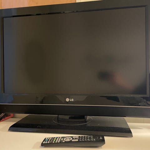 LG TV i svart farge. Står på bordstativ og leveres med fjernkontroll slik det vises på bildene. Egner seg til vanlig TV-bruk og tilkobling av eksterne enheter via tilgjengelige innganger på baksiden eller siden av TV-en, avhengig av modell.