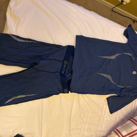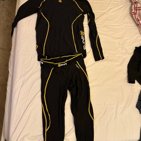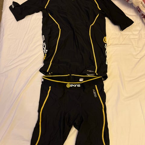 Skins kompresjonssett for løping til herre i størrelse XL. Sett består av langermet overdel og lang kompresjonsbukse. Farge svart med gule detaljer og Skins-logo. Egnet som teknisk undertøy eller treningssett til løping og annen utholdenhetstrening.