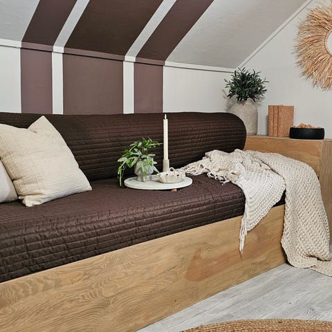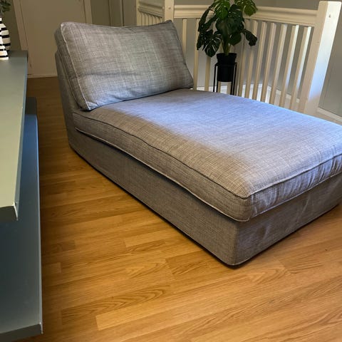 Selger en praktisk og plassbesparende IKEA Vallentuna modul med uttrekkbar seng i fint beige tekstiltrekk. Når den ikke er i bruk, slås den enkelt sammen til en stilren puff.