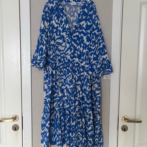 Super sommerkjole i størrelse S. Kjolen er laget av 100 % bomull og har et flerfarget mønster i blått og hvitt. Modellen har lange ermer og et lett, vevd stoff som egner seg til bruk på varme dager.