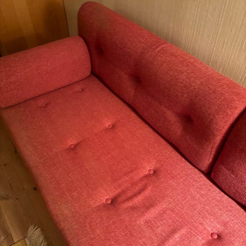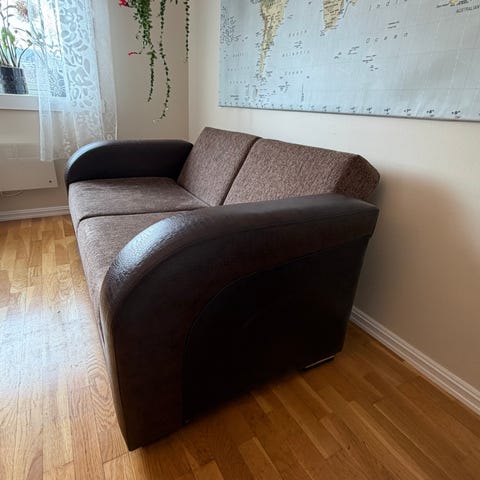 En sovesofa med litt spesiell farge og oppgitt størrelse (ikke utslått) selges med gi-bort pris. Det er skuff under sofa som har plass til dyne og puter. Mulig å ta av trekk å vaske.