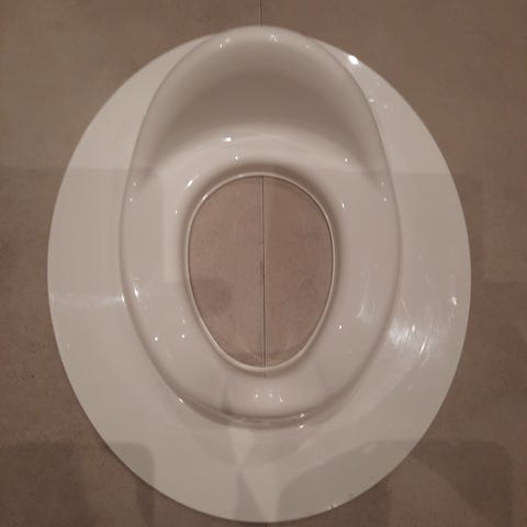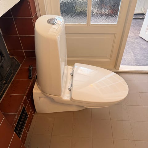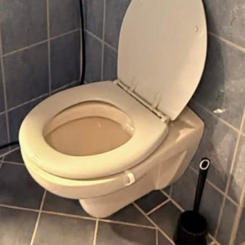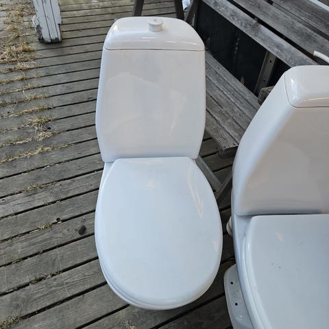 Gulvstående toalett i hvit farge. Klassisk modell med sisternemontert spyleknapp og standard toalettsete. Passer for montering på bad eller toalettrom med avløp i gulv. Må hentes.