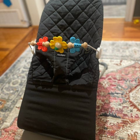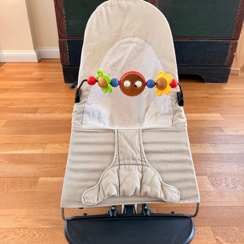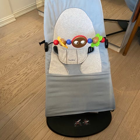 Babybjörn vippestol. Stolen har polstret sete med quiltet trekk og integrert seleåpning. På fronten er det festet en leke med fargerike figurer som barnet kan se på og gripe etter. Egnet som sitteplass og hvileplass for små barn i hjemmet.