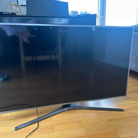 Samsung 42" TV med medfølgende fjernkontroll. TV-en står på et kryssformet bordstativ i metall. Fjernkontrollen har egne knapper for meny, guide, verktøy, info, retur og fargeknapper (rød, grønn, gul, blå).