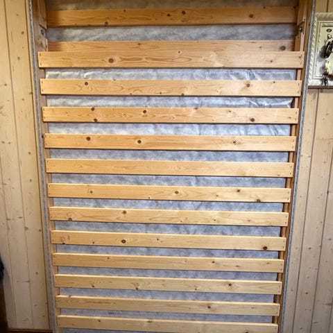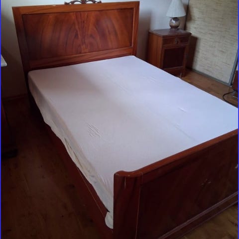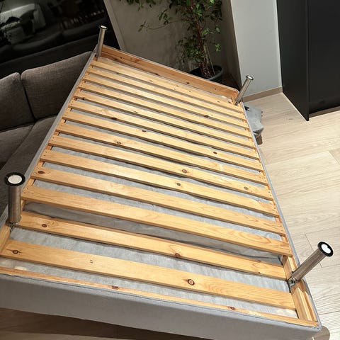 Rammemadrass - seng - gis bort. Noe slitasje i stoffet (se bilder), men madrassen er fortsatt god. Beina er skrudd av for enklere håndtering, men kan enkelt skrus på igjen.