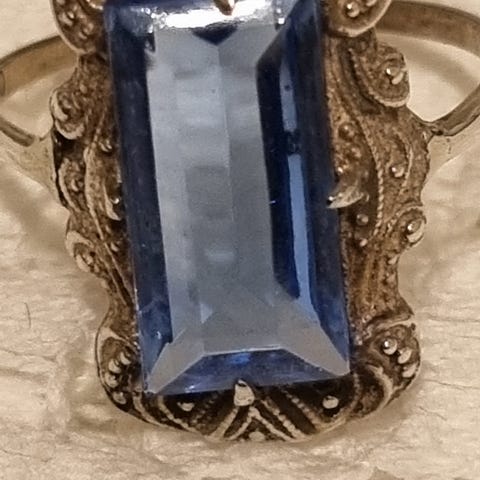 Ringen har en stor, fasettslipt blå stein -trolig akvamarin eller topas i klassisk fatning.