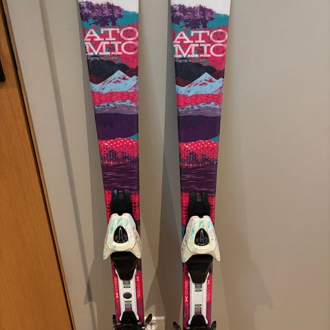 Völkl Pyra 118 cm alpinski i lilla og hvit farge. Skiene har Marker bindinger som er montert på skiene. Pyra er en twintip/allmountain-inspirert alpinski som egner seg til vanlig kjøring i bakke og park. Design med lilla overside med mønster og hvit såle med tydelig Völkl-logo. Skiene er ny preppa siste dag i fjorårets sesong (kr 750) og ikke brukt etter det. Bra kanter og såle.