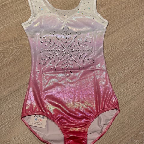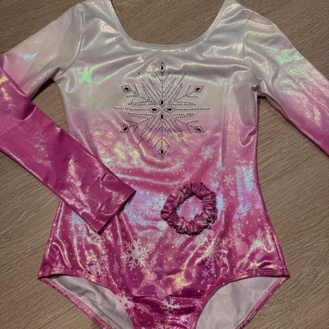 Nydelig, helt ny turndrakt i rosa og hvitt med snøfnugg og rhinestones og matchende hårstrikk.