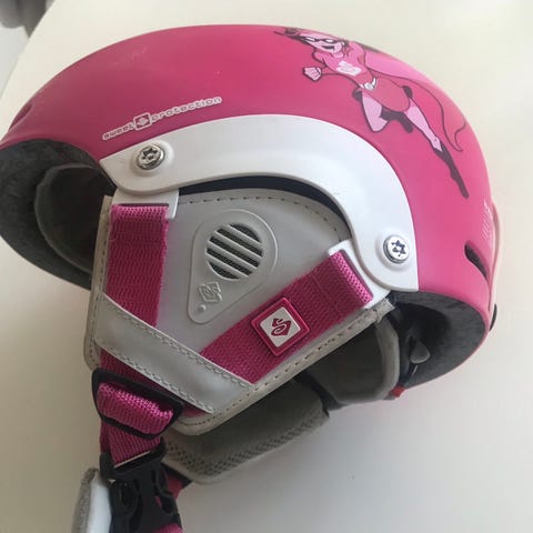 Pent brukt Frost hjelm for barn, størrelse S (50–54 cm). Hjelmen har hardt ytterskall i plast og innerskall i EPS-skum. Flere ventilasjonshull i skallet for lufting. Myk, polstret innside og øreparti for økt komfort. Justerbar hakestropp med klipsfeste. Egnet for alpint og skøyting m.m.
