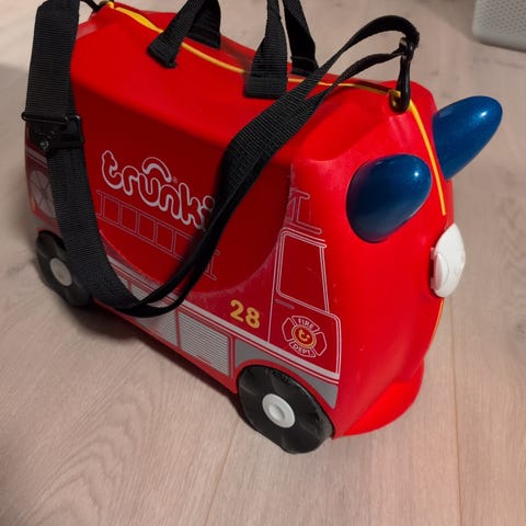 En trillekoffert til barn formet som en brannbil - Passer som håndbagasje på flyreiser. Sitt på brannbilen mens en voksen holder i båndet. Morsom reise med en ny Trunki trillekoffert til barn!