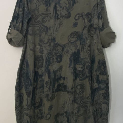 Sandwich kjole i størrelse M. Kjolen er laget av bomull og har et blått mønster. Modellen har lange ermer og rund hals. Passer som hverdagskjole til ulike anledninger.