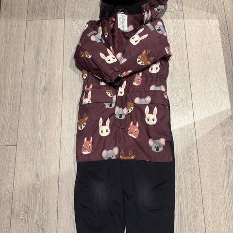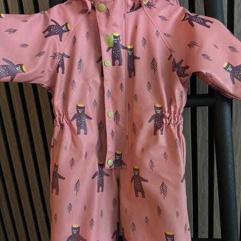 FIX parkdress for barn i størrelse 104, unisex. Dressen har flerfarget mønster med dyr på overdel og ensfarget mørk underdel. Hetten er festet og dressen har lange ermer og ben. Ytterstoffet er merket som vanntett. Passer til bruk i barnehage og utelek i overgangs- og høst/vårsesong, avhengig av hva som brukes under. Laget i Kina, merket med «Waterproof fabric» på innsiden.