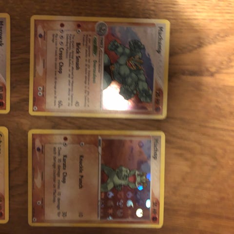Pokémon samlekort blandet lot med ulike korttyper. Bildene viser flere forskjellige Pokémon, både vanlige kort og holo/reverse holo-kort i ulike serier og utgaver. Kortene har forskjellig motiv, type og styrkeverdier. Egner seg for samling, bytting eller som tillegg til eksisterende kortstokk i Pokémon Trading Card Game. Antall og nøyaktige serier fremgår av bildene.