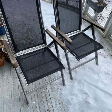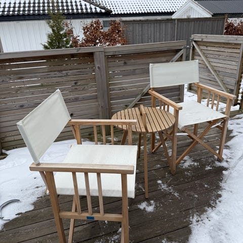 Sammenleggbare hagestoler i grå tekstil med polstret sete og rygg. Stolene har metallramme og lav sittehøyde, egnet som loungestoler til uteplass, terrasse eller hage. Rygg og sete er trukket i stoff med enkel polstring for økt sittekomfort. Stativet er utformet med meder som gir stabilitet på fast underlag. Leveres som sett med to stoler.