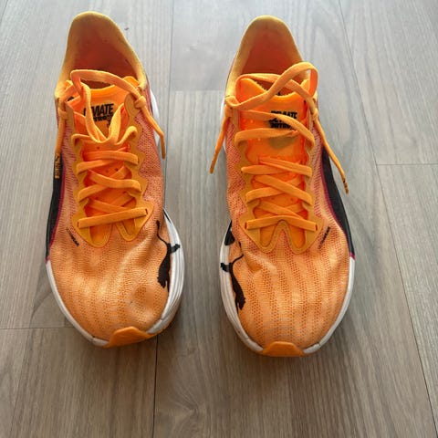 Puma løpesko i størrelse 39. Skoene er hvite med flerfargede detaljer i mellomsålen og svart Puma-logo. Overdelen er i pustende mesh-materiale med snøring for justerbar passform. Yttersålen har mønster for grep ved løping på asfalt og lignende underlag. Egnet til løping og annen trening utendørs eller innendørs