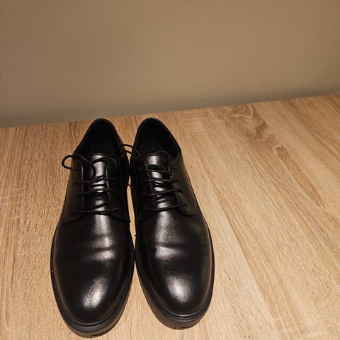 Versace for H&M pensko i størrelse 44. Klassiske snøresko i svart lær med messing detaljer. Modellen har lav hæl og glatt overdel. Egner seg til formelle anledninger og bruk sammen med dress eller penbukse.