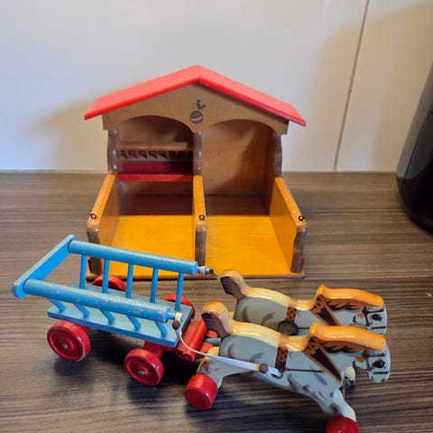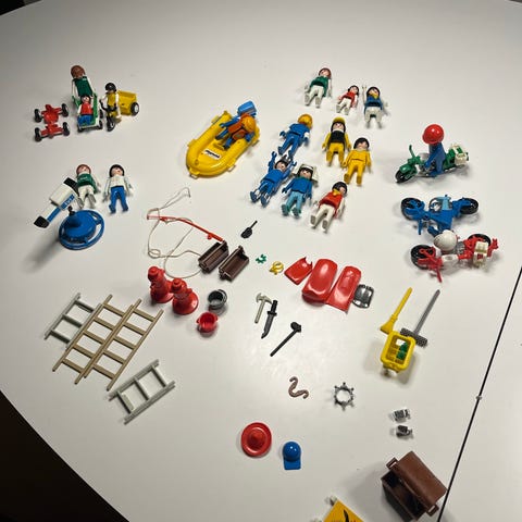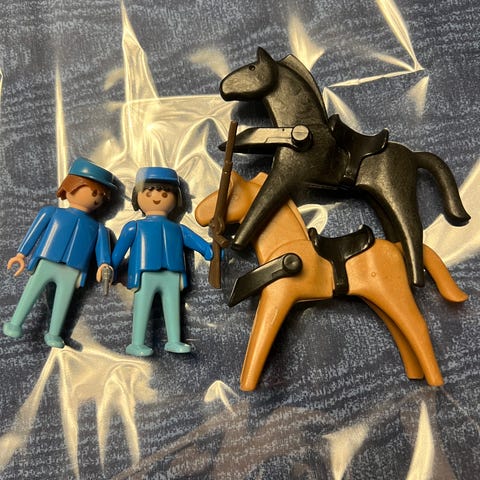 Playmobil med en figur, brun hest, gult inngjerdet område, to motorsykler og tilbehør. Settet inkluderer en Playmobil-figur som kan sitte på hesten, en brun hest med bevegelige deler, gule gjerder som kan settes sammen til en liten innhegning, to motorsykler i ulike farger samt mindre tilbehør som bøtte og hvit bensinkanne.