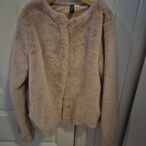 Faux fur jakke i størrelse M-L. Har ikke vært brukt på kjempe lenge og er ingen synelige bruksmerker. Den har vært lagret i en kasse på boden.