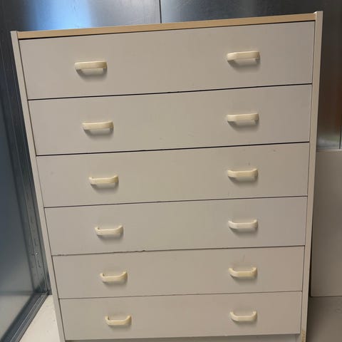 Hvit kommode gis bort pga flytting. Har stått i bod og brukt til oppbevaring. Må hentes.