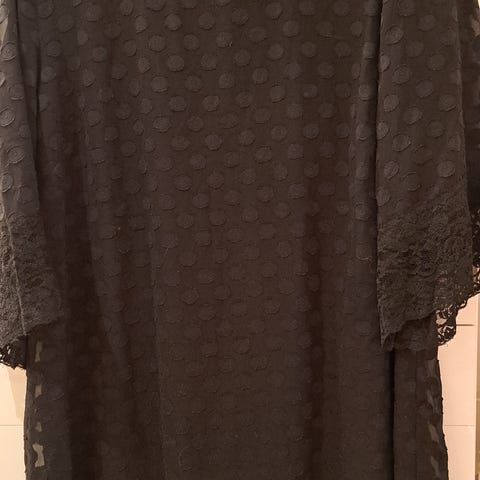 Gina Tricot festkjole for dame i størrelse XL. Kjolen er svart og laget av polyester. Modellen har lange ermer og omslagseffekt foran med knyting i midjen. Lengden går omtrent til over kneet, avhengig av høyde. Passer som enkel festkjole eller til andre anledninger der man ønsker en mørk, ensfarget kjole med markert midje.