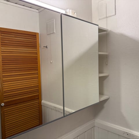 Morsomt speilskap, sannsynlig fra 80-tallet. B 65,5 cm. D 12,5 cm. H 50 cm (uten lampe). Lampe på toppen følger med. 2 glasshyller og speil som kan skyves til sidene er hel og pen. Bakveggen er i metall og spikret mot skapet og løsnet på et hjørne når jeg tok ned skapet (tror den var limt mot veggen i tillegg). Se bildet. Kan overleveres på Øya/St. Olavs/Magnus den godes gate.