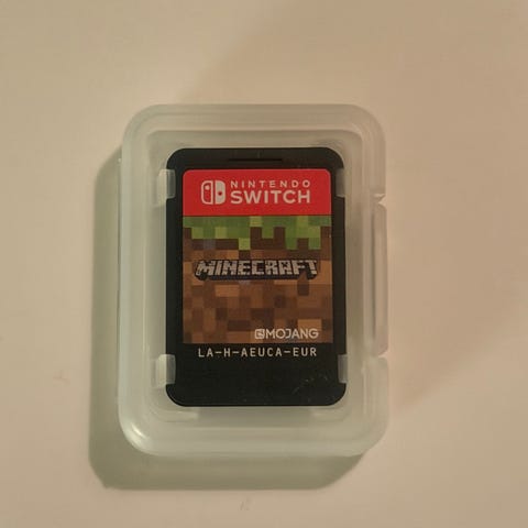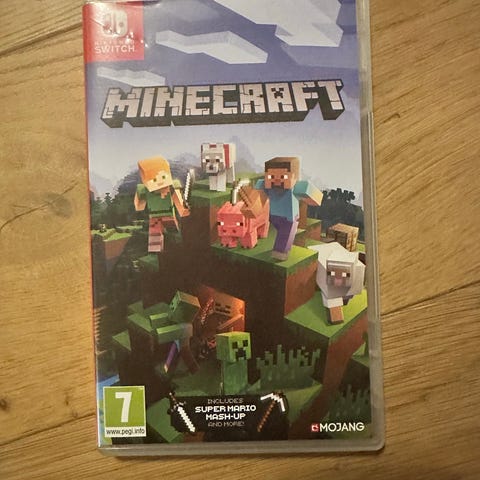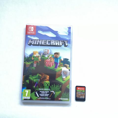 Fysisk spillkassett med omslag. Spillet er merket PEGI 7. Minecraft er et sandkassespill der spilleren kan bygge, utforske og overleve i blokkerte verdener i både kreativ og overlevelsesmodus. Støtter enspillermodus og flerspiller via Nintendo Switch, avhengig av konsollens innstillinger og nettverkstilkobling.