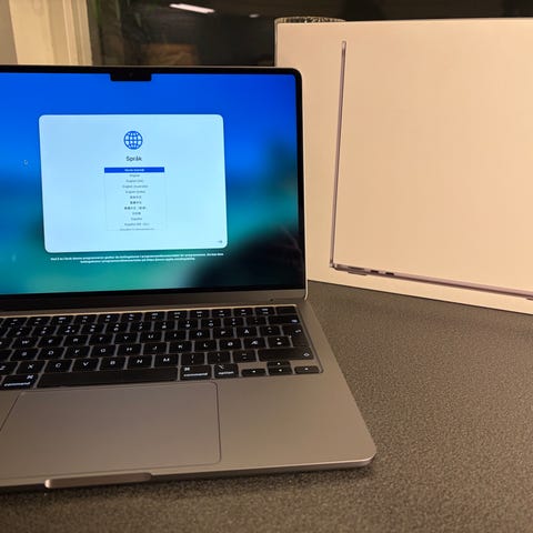 Selger en MacBook Air M2 13" med M2-brikke og 8 GB minne i sølvfarge. Kjøpt i januar 2023, kvittering følger med.