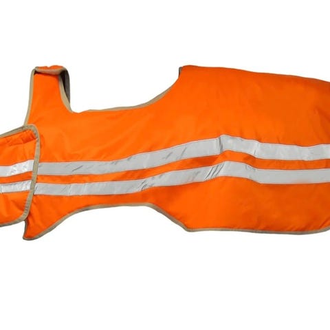 Refleksregndekken til hest i gul farge. Dekkenet har høy synlighet med refleksdetaljer i rutemønster langs siden. Utformet for å ligge over hestens rygg og bakpart, med utsparing foran for sal og rytter. Egnet til bruk ved ridning i mørke eller dårlig sikt, for å gjøre hest og rytter mer synlige i trafikken. Materialet er glatt og vannavvisende. Detaljer som stropper og lukking fremgår av bildene.