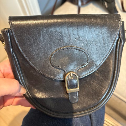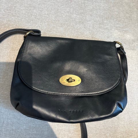 Praktisk liten håndveske i ekte lær fra Italia. Konjakk farge. Meget pent brukt. Komme med glidelås i front og bak. Lukking med glidelås og liten innerlomme med glidelås.