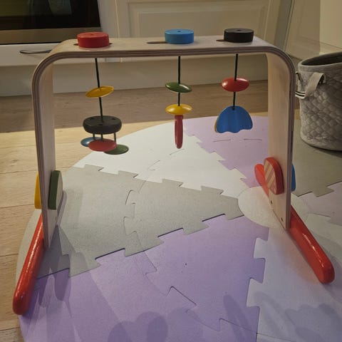 IKEA babygym i tre med flerfargede leker. Babygymmen har en stabil ramme i treverk med rød bunnlist og buet overdel. Hengende leker i ulike former og farger gir visuell stimulering og mulighet for å trene grep og koordinasjon for spedbarn som ligger på rygg. Egnet for bruk på gulv oppå teppe eller matte under tilsyn av voksen.