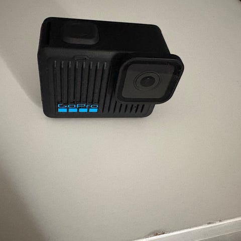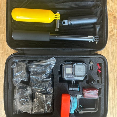 GoPro actionkamera med oppbevaringsetui og tilbehør.