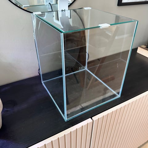 Akvarium i glass med tilhørende utstyr. 20 liter. Settet inkluderer et rektangulært glassakvarium, innvendig filterpumpe, akvarievarmer, lysrør/lampe, foringsautomat, samt håv og trebit og vasket sand til bunnen.