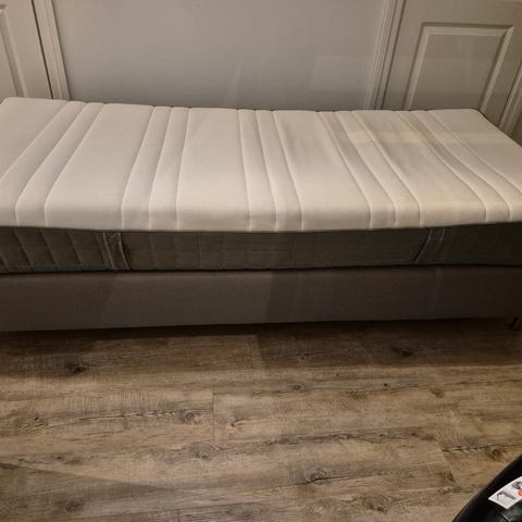 Den er helt fin å ligge på og har ingen andre skader enn hjørnet. Fast madrass. Har med 5 cm bein og en tynn overmadrass.