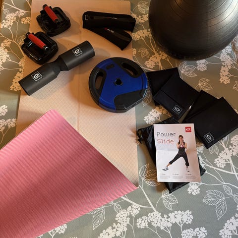 Pent brukt utstyr som har blitt brukt i et lite yogastudio.