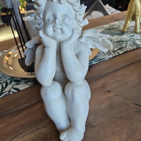 englefigurer dekor i hvit farge. To stående engler med vinger, plassert på kuler med sokkel. Passer som innendørs pynt gjennom hele året, for eksempel på hylle, kommode eller i vitrineskap. Figurenes materiale fremstår som keramikk eller lignende hardt materiale.