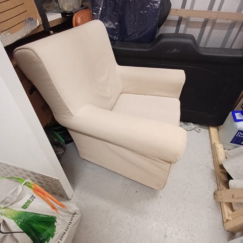 Mørk brun lenestol med puff. Nuppete. God å sitte i.