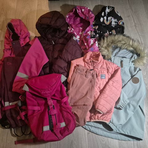 Stor klespakke med vinterdress, vinterjakke, regnbukse mm. Str 110