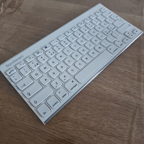Sandstrøm trådløst tastatur i hvit farge. Kompakt layout med lave taster. Tastaturet har innebygd oppladbart batteri og lades via mikro-USB-port på siden. Passer som tilleggsutstyr til datamaskin, nettbrett eller andre enheter som støtter trådløs tilkobling til tastatur. Bakside i metall med gummiknotter for stabilitet på bordflate.