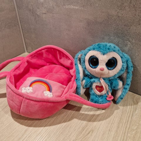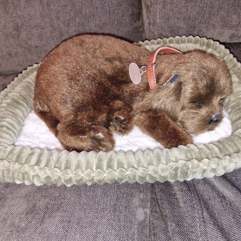 Meget pent brukt hundebamse med koselige valpelyder. Lukker øyne når man setter i smukken. Ingen synlige merker.